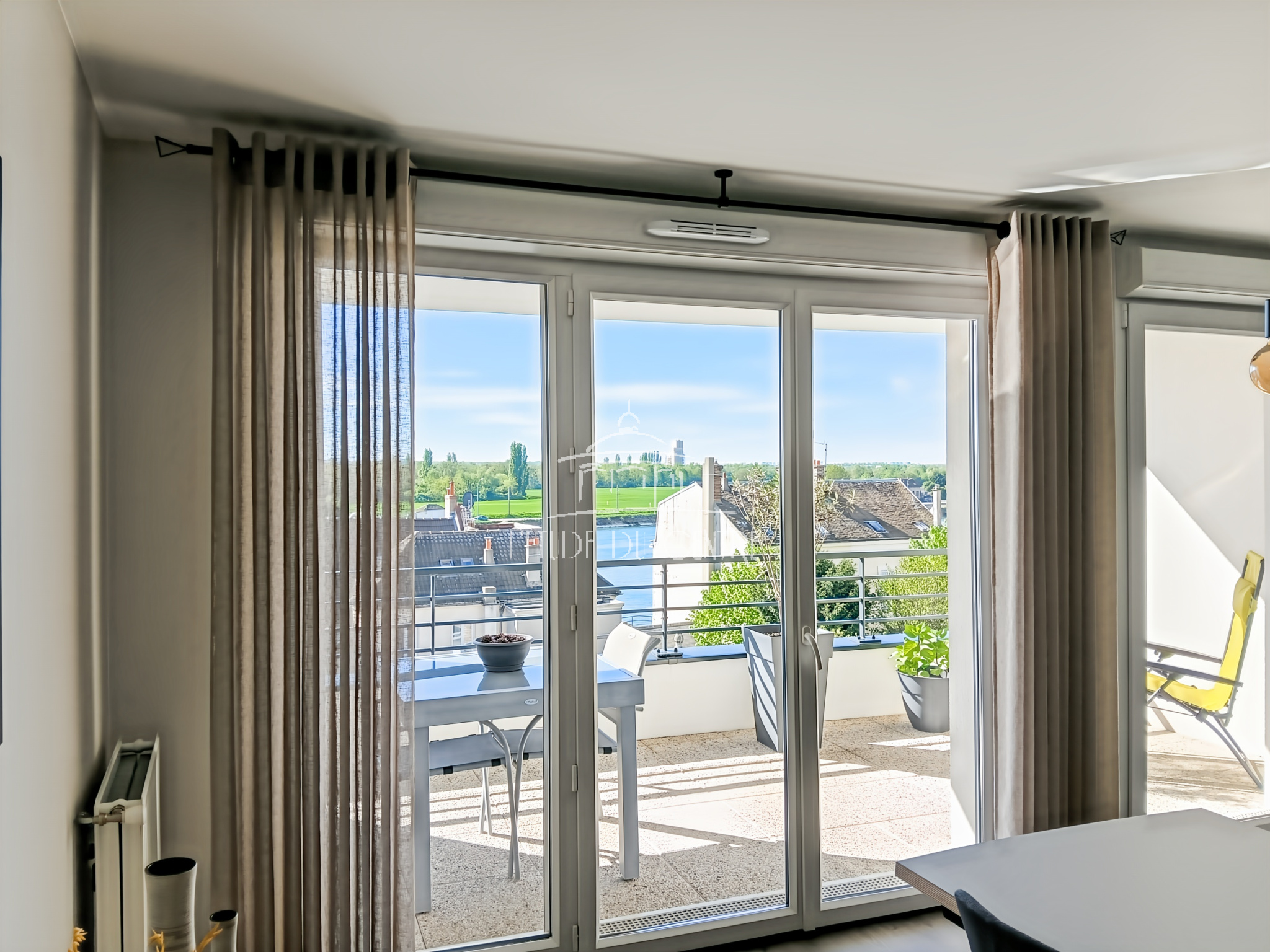 Une entrée, un séjour avec cuisine américaine donnant sur une terrasse orienté plein Sud vue Seine, trois chambres dont une avec une salle d'eau attenante, une salle de bains avec WC, placards et WC séparé.